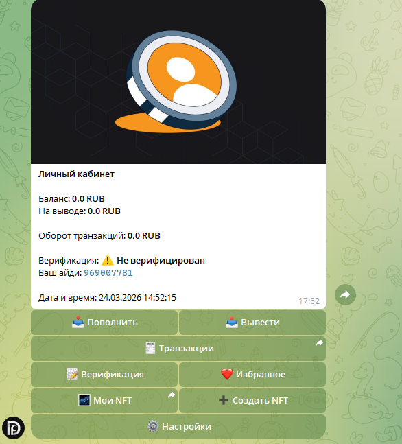 Телеграмм-бот «Дизайн Плейс» нужно запустить, чтобы попасть в меню личного кабинета и увидеть основные кнопки для навигации. Пользователю предложено создать собственное NFT, которое он потом якобы сможет продать на одной из подключенных к системе площадок.