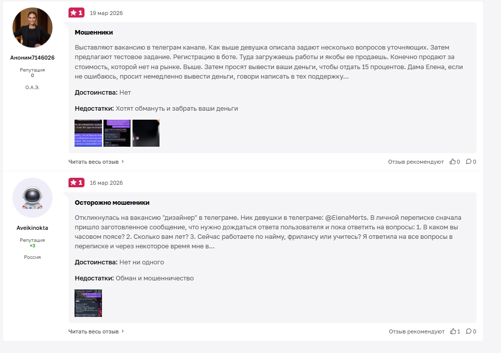 Исходя из отзывов в интернете, мы узнали, что бот продвигают сомнительные телеграмм-аккаунты, например, пользователь Елена Мерц и другие. Утверждается, что эти люди выставляют вакансии в разных каналах, а потом связываются с соискателями напрямую и предлагают возможность заработать.