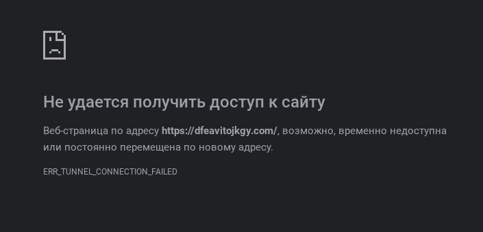Далее при переходе по ссылке на сайт Dfeavitojkgy com возникла ошибка. Как только мы зашли на страницу, получили следующее предупреждение — «Не удается получить доступ к сайту. Веб-страница по адресу, возможно, временно недоступна или постоянно перемещена по новому адресу. ERR_TUNNEL_CONNECTION_FAILED».