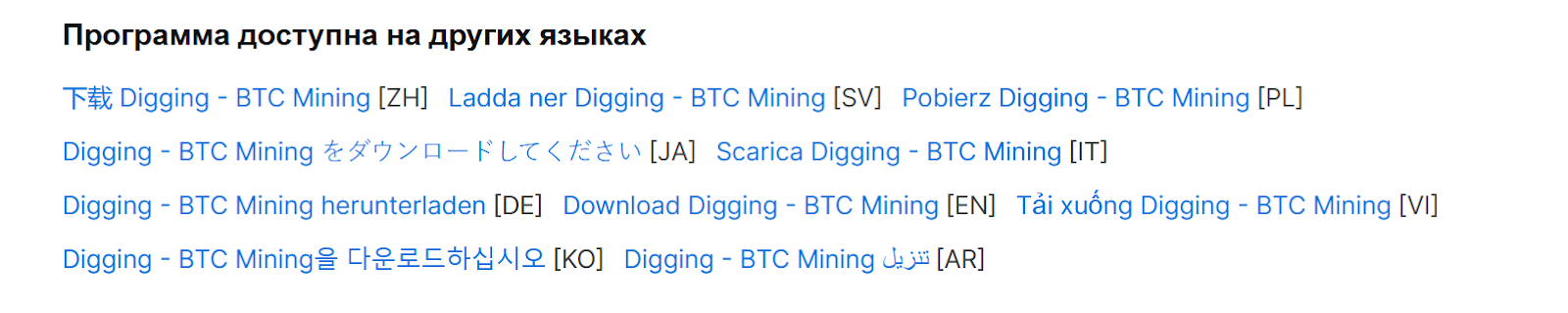 Digging BTC Mining — софт для смартфонов на Android, предлагает майнинг криптовалют, но не озвучивает условия.