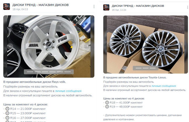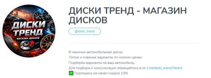 Телеграмм магазин «Диски Тренд» предлагает недорогие литые и кованые автодиски, а также готовые комплекты с покрышками. Точная дата открытия канала неизвестна, также отсутствует информация о владельце компании.