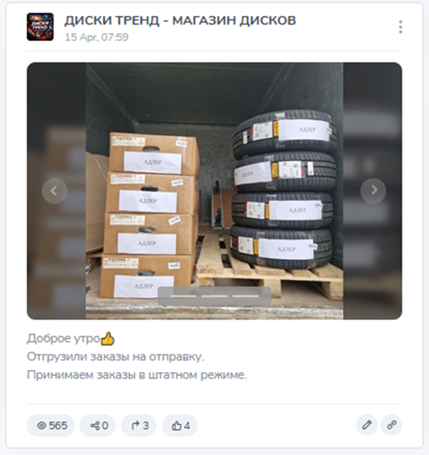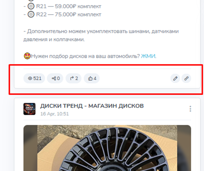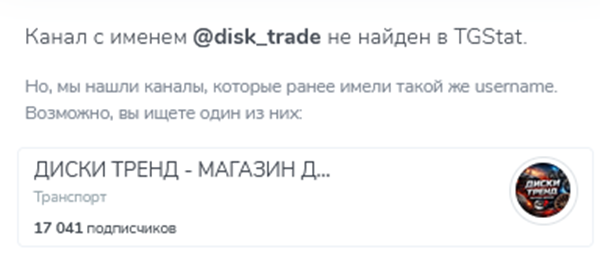 По данным TGStat этот ТГ-магазин сейчас сменил название на «Диски Тренд». Также в сети удалось найти ТГК-клоны с аналогичным контентом, но под различными названиями – «Диски и Колеса», «Колесный Shop» и другие.