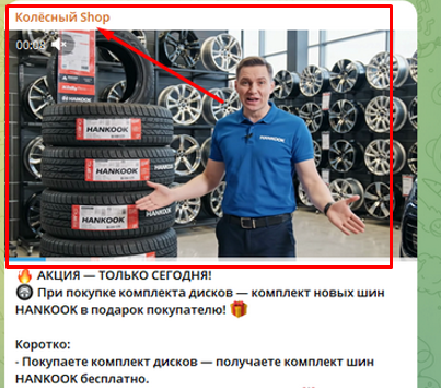 Периодически повторяется акционное предложение о продаже готовых наборов с дисками и покрышками Hankook. Это короткий видеоролик, сгенерированный при помощи нейросетей. Показан большой магазин с выбором продукции и якобы менеджер, который рекламирует товар. Но, вероятнее всего, это изображение просто служит фоном, оно взято из сети. Человека из видео не существует, вся реклама является результатом обычной работы видеоредактора.