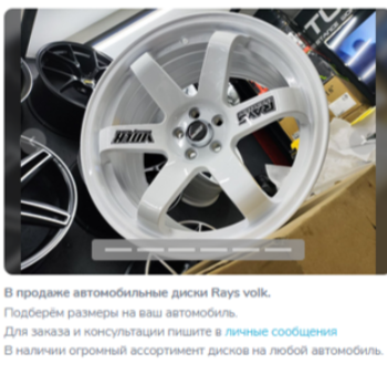 На своем официальном канале магазин дисков «Диски Тренд» публикуют фотографии продаваемых дисков для разных машин. Авторы пишут, что в продаже есть различные модели, например диски от Rays Volk. Для консультации нужно писать в личные сообщения канала.