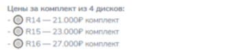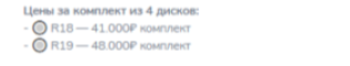 В зависимости от марки и качества приобретаемых шин и других аксесуаров, товары в телеграмм-магазине дисков «Диски Тренд» продают по разной цене. Часто диски и шины продают комплектами, например комплект из четырех дисков для Toyota 18 радиуса стоит ₽41,000, а 19 радиуса продается за ₽48,000.