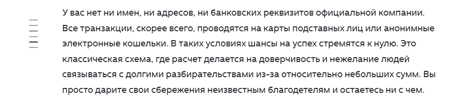 - Проект не имеет гарантий и документов, т.е., может работать нелегально и вернуть деньги будет нельзя.