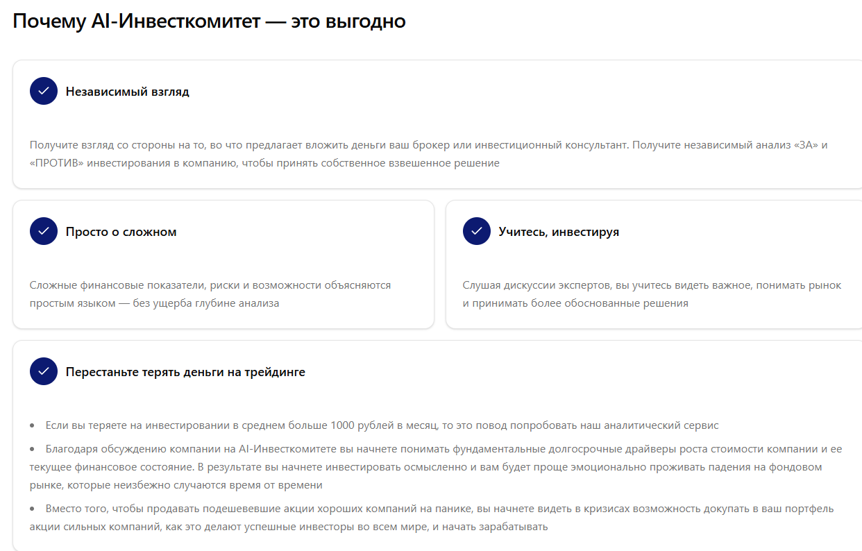 Никаких конкретных преимуществ софта разработчики не смогли назвать – и это основная проблема. Нам, конечно, рассказывают, что так инвестор получает независимый взгляд, учится и т.д., но это не выглядит как серьезные аргументы.