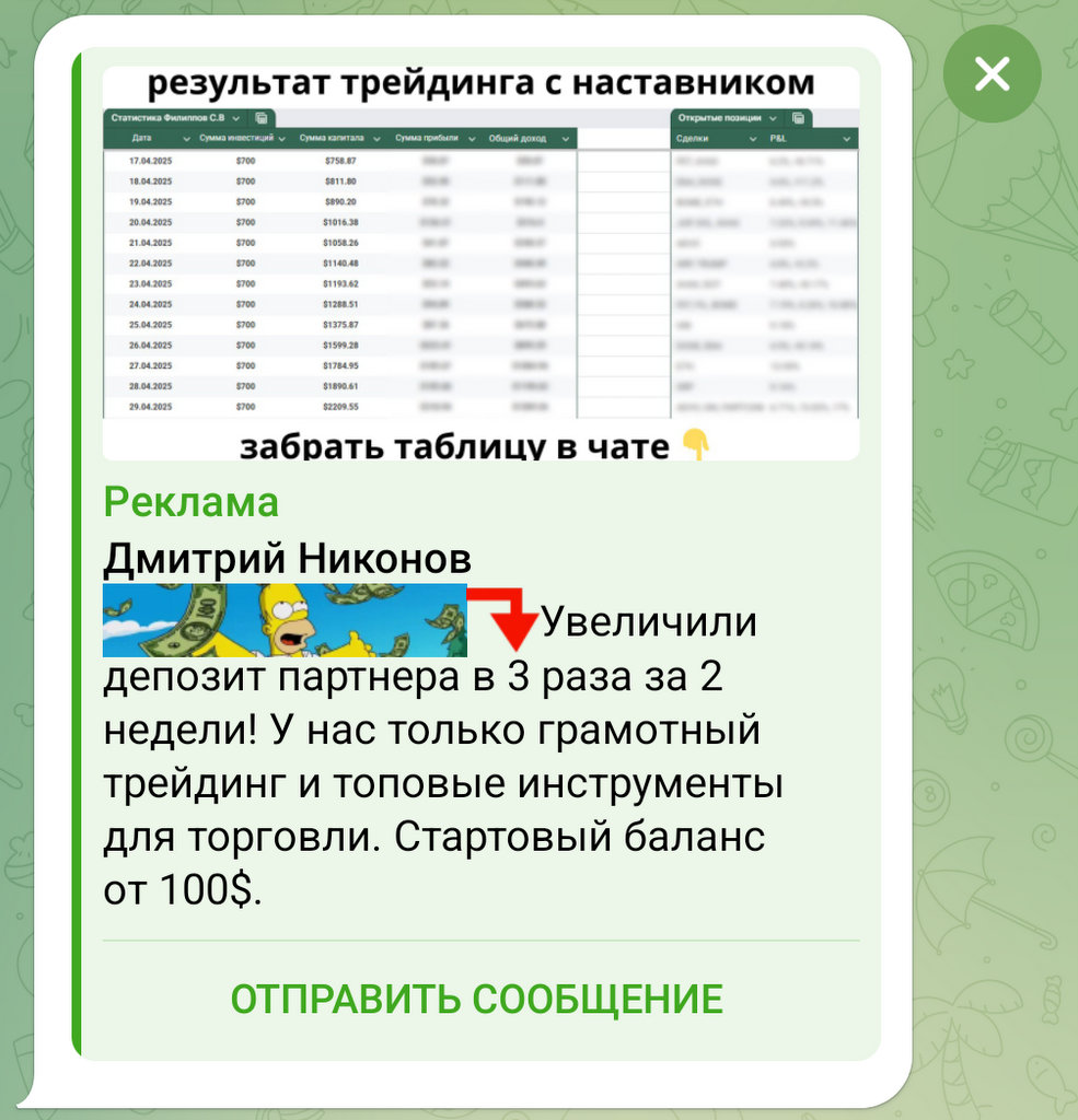 Этот так называемый «топ-трейдер» Дмитрий Никонов — просто очередной мошенник, скрывающийся за анонимным профилем в Telegram. Никаких доказательств его успехов, лицензий или реальных отзывов нет. Обещания баснословных доходов без риска — явный признак развода. Не дайте себя обмануть!