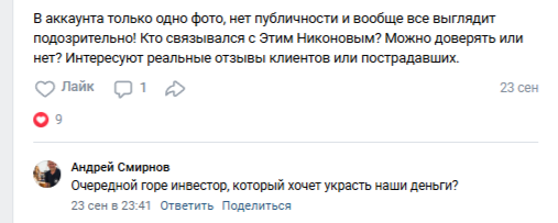 Ни положительных, ни отрицательных отзывов о деятельности трейдера Дмитрия Никонова в сети нет. Некоторые пользователи на просторах интернета интересуются тем, можно ли заработать с данным финансистом, но другие юзеры недоверчиво относятся к заявленным условиям и малому количеству информации.