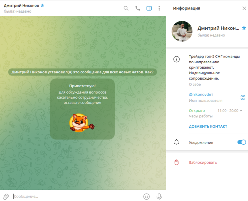 Дмитрий Никонов не имеет собственного тг-канала, работает со своего личного аккаунта в мессенджере. Трейдер заявляет о том, что является частью некой команды аналитиков, но не раскрывает более подробной информации. Также Никонов предлагает индивидуальное финансовое сопровождение. Что именно он вкладывает в это понятие, не уточняется.