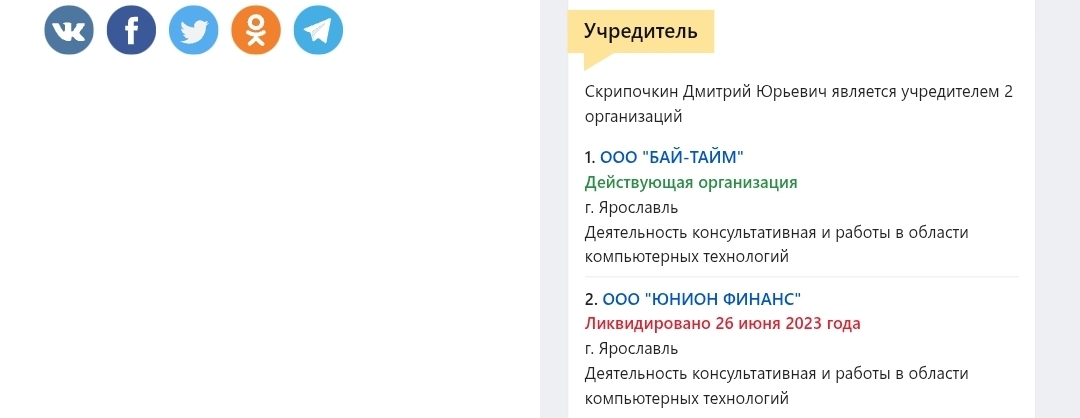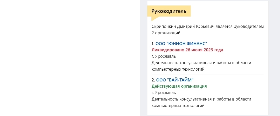 До «Бай-Тайм» Скрипочкин руководил ООО «Юнион Финанс». Компания была зарегистрирована в декабре 2020 года и ликвидирована в июне 2023-го — ровно в тот момент, когда уже работала «Бай-Тайм». Схема смены юридических лиц при продолжении той же деятельности — стандартная практика, но в сочетании с исполнительными производствами она добавляет вопросов.
