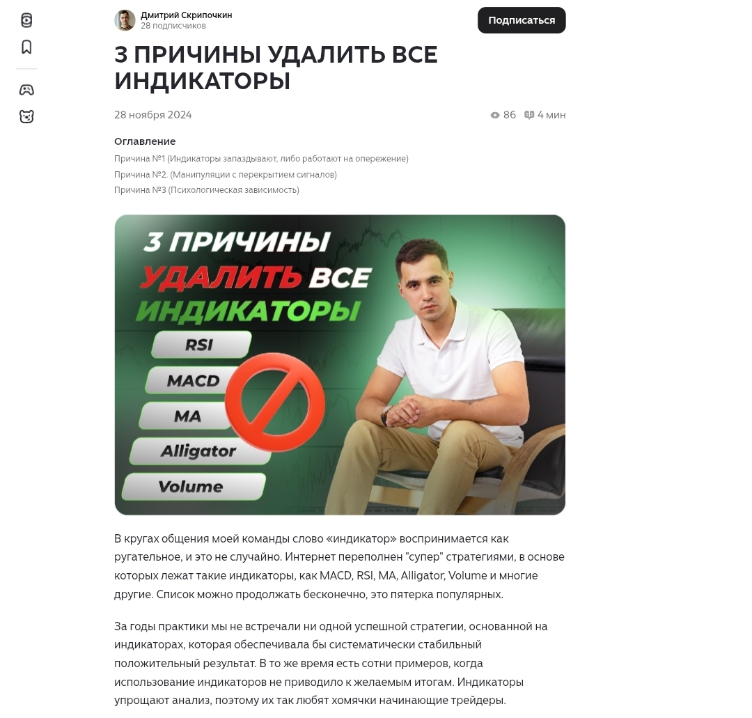 Центральная идея контента Скрипочкина — торговля без классических индикаторов. В статье «3 причины удалить все индикаторы» он подробно разбирает, почему RSI, MACD, MA, Alligator и Volume не дают системного результата: индикаторы запаздывают или работают на опережение, они создают массовые одинаковые сигналы, которыми пользуются крупные игроки для манипуляций, и в итоге формируют психологическую зависимость у трейдера. По словам автора, за годы практики его команда не нашла ни одной индикаторной стратегии с устойчивым положительным результатом.