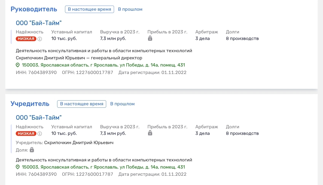 - ООО «Бай-Тайм» — действующее юрлицо Скрипочкина — имеет низкую оценку надежности, 3 арбитражных дела и 8 исполнительных производств по долгам;
