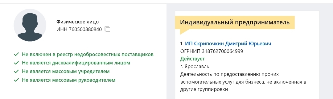 Дмитрий Юрьевич Скрипочкин зарегистрирован как ИП в Ярославле с октября 2018 года. Основной вид деятельности — прочие вспомогательные услуги для бизнеса. Статус формально действующий, но по данным открытых реестров ФНС приняла решение о предстоящем исключении этого ИП из ЕГРИП как недействующего. Проще говоря — ИП числится живым, но налоговая уже готовится его закрыть.