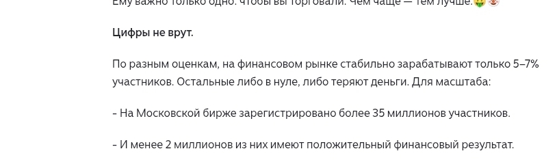 Что примечательно — в статье о рисках инвестирования Скрипочкин прямо пишет: на финансовом рынке стабильно зарабатывают лишь 5-7% участников. Для большинства людей, которые не готовы относиться к трейдингу как к профессии, банковский вклад принесет больше пользы. Для человека, продающего курсы по трейдингу, это нетипично честное заявление — или очень грамотный маркетинговый ход, создающий образ «честного эксперта».