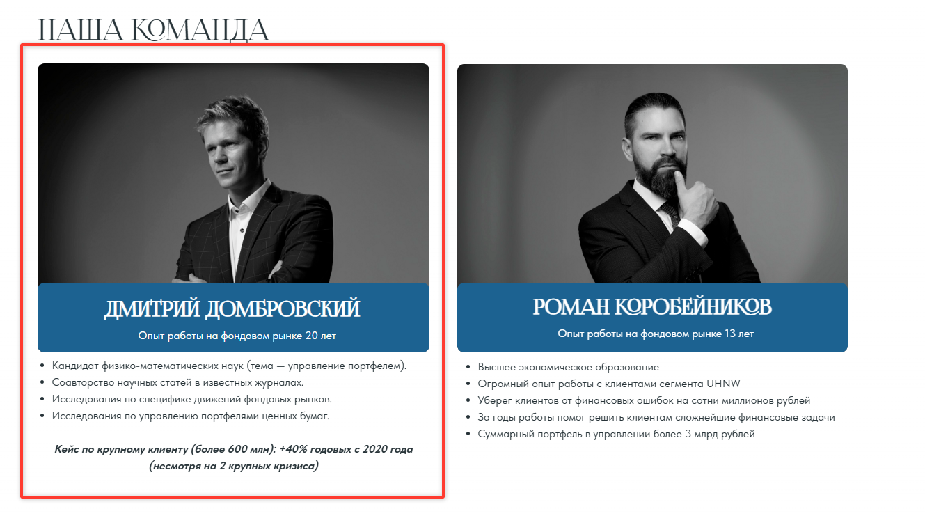 С учетом заявленного стажа на фондовом рынке с 2005 года, Домбровский позиционирует себя как стратега старой школы, чья экспертиза прошла проверку несколькими глобальными кризисами.