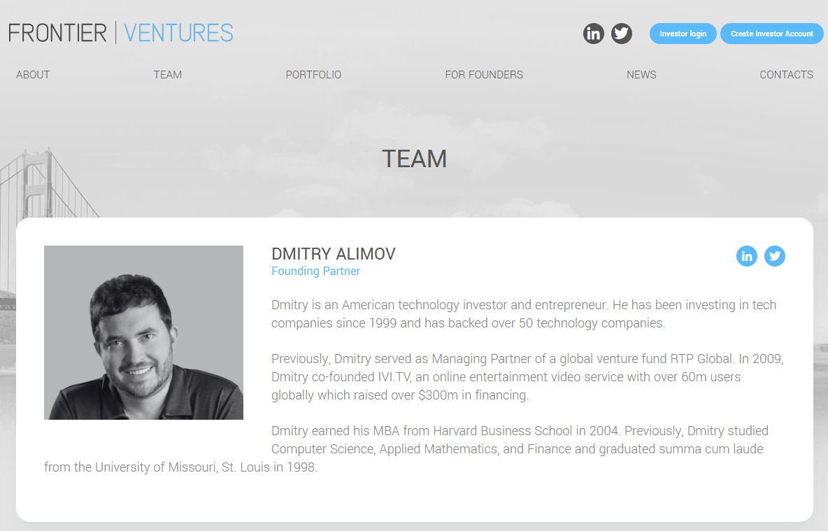 На странице проекта размещена краткая биография Дмитрия Алимова. Он занимается инвестициями 1990-х годов. Ранее он был связан с венчурным фондом RTP Global и участвовал в создании видеосервиса IVI TV. Отдельно отмечается образование инвестора – MBA Гарвардской школы бизнеса. При этом реально успешных примеров его работы в интернете нет.