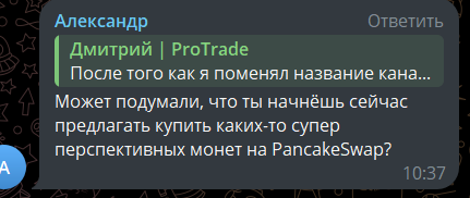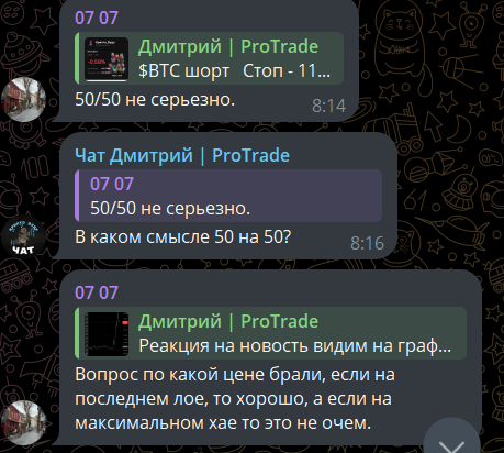 Активное общение ведется на втором канале «Чат Дмитрий | ProTrade». Администратором заявлен Cryptovod777, к которому и предлагается обращаться по всем вопросам. Но и тут активность не сильно высокая, количество подписчиков 72. Канал открыт для комментирования, пользователи могут оставлять собственные посты и отзывы.