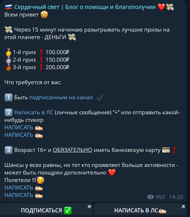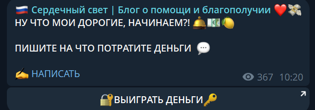 В телеграм-канале «Сердечный свет блог о помощи и благополучии» подписчикам предлагают участие в конкурсе с денежными призами. Разыгрываются достаточно крупные суммы в сотни рублей и для этого нужно быть просто подписанным на канал и отправить заявку во время проведения розыгрыша. Все это выглядит подозрительно щедро, поэтому многие относятся с недоверием. В этой статье мы рассмотрим, действительно ли здесь раздают деньги подписчикам или тут применяется какая-то мошенническая схема.