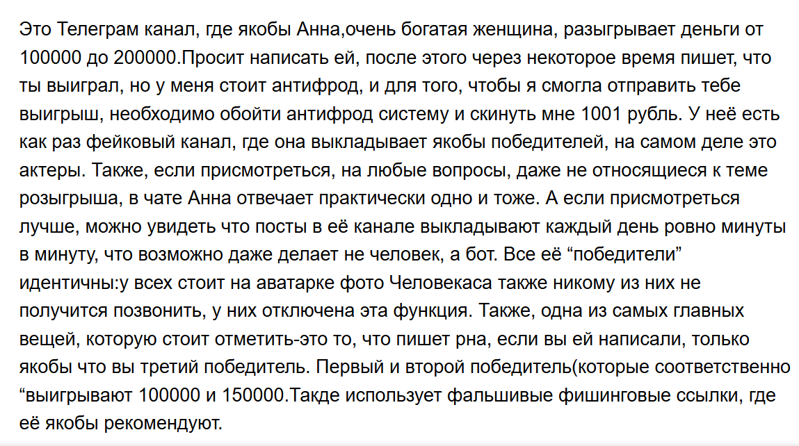 Основной контент телеграм-канала Dobroyaanna состоит преимущественно из информации о раздаче денег, обращений администрации на видео и постов с переписками клиентов. Тут постоянно хотят убедить пользователей, что все проводится честно и описываются условия, с которыми придется столкнуться потом. Это все делается настолько часто, что выглядит подозрительно. Пользователям рассказывают о системе антифрод, благодаря которой победителю нужно сначала скинуть деньги на карту отправителя, а только потом уже получить приз.