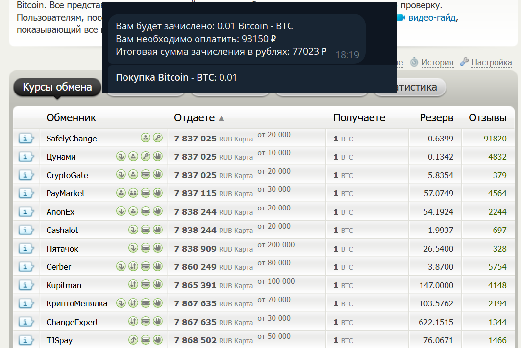 Курс обмена достаточно высокий, например, 0.01 BTC в середине января 2026 года предлагали купить за ₽92,000, хотя на других сервисах цена составляла ₽78,000.