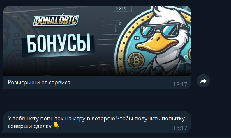 Donald_Btc_Bot обещает выгодный обмен криптовалют, но на деле курс завышен, а личность владельца скрыта. Активность в чате поддерживается розыгрышами, что вызывает сомнения в надежности сервиса.