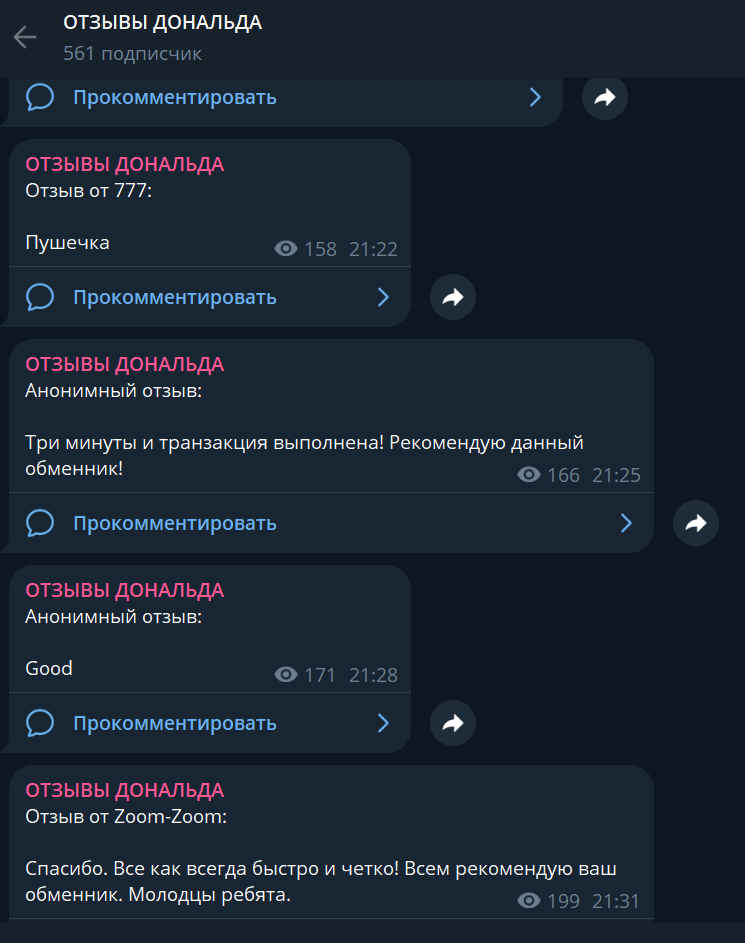 В сети отсутствуют отзывы об обменнике в Телеграм с ником Donald_Btc_bot, зато владелец запустил отдельный канал, где выкладывает сообщения от пользователей, причем он их даже не пересылает, а просто пишет текстом.