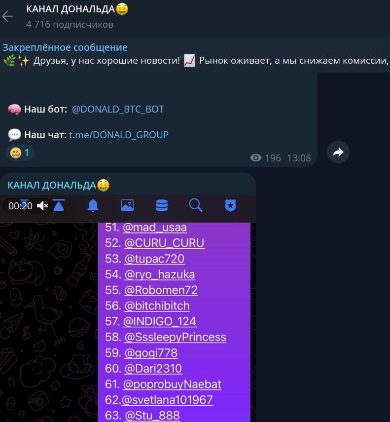 В группе Telegram с ником Donald_Group более 11 000 участников, а большинство постов представляют собой скриншоты интерфейса бота, но это нужно по условиям конкурса. Также у проекта есть канал с ником Donald_Btc_Info, где 4700 подписчиков, но посты просматривают около 200, что может указывать на накрутку.