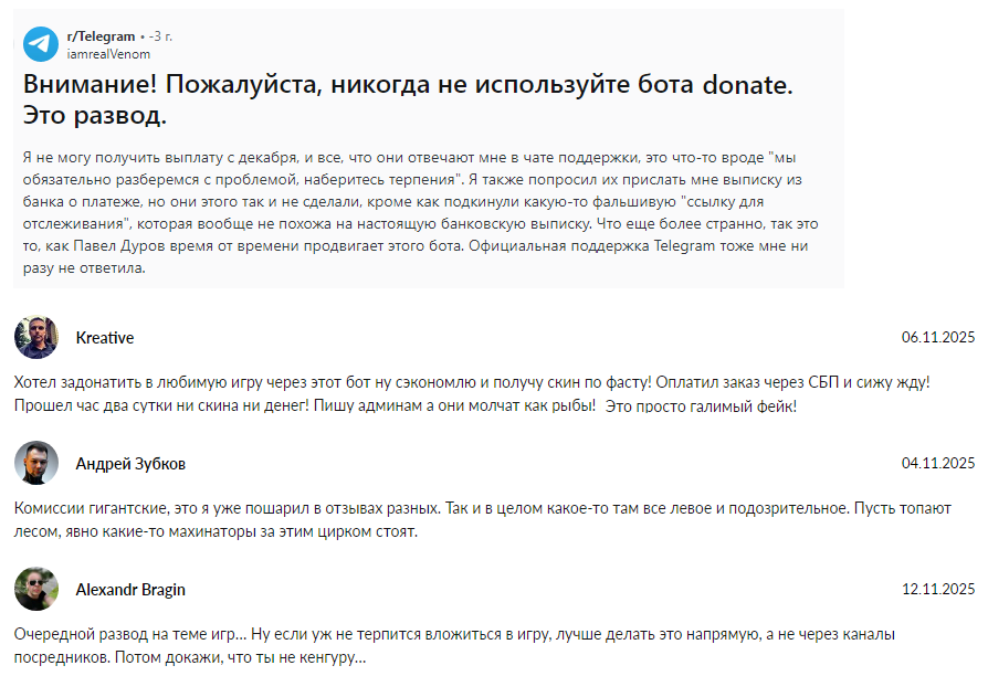 Граждане массово жалуются на блокировки их профилей, присвоении денежных средств создателями скам-проекта и невозможности решения технических проблем. Пользователи утверждают, что эксперты из техподдержки не могут компетентно решать вопросы и советуют юзерам ждать момента, когда проблемы решатся сами собой. Подтверждений того, что специалисты, отвечающие за поддержку граждан на площадке Telegram Donate Mobile bot, обладают высоким уровнем профессионализма, нет.