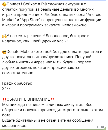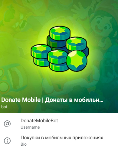 Создатели программы Donate Mobile bot указали в Telegram профиле, что ресурс предназначен для покупок в мобильных приложениях.