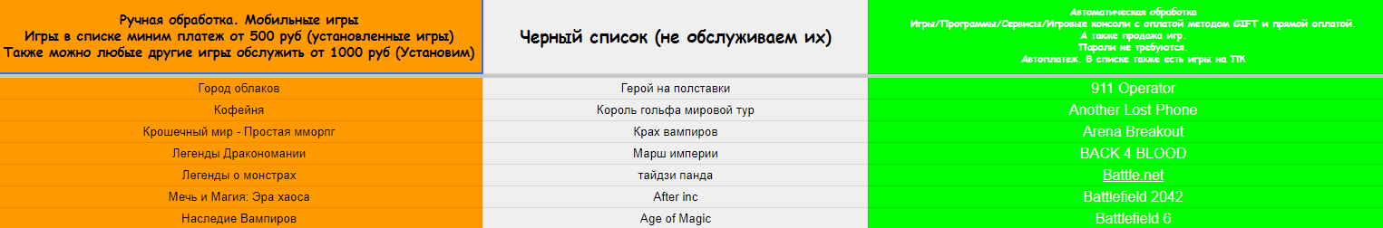На площадке размещен список гейм-сервисов, поддерживаемых роботом «Донат Мобиле». Также людям предоставляют данные о порталах, с которыми организаторы пэй приложения не работают, и об играх, в которых оплата донатов осуществляется автоматически.