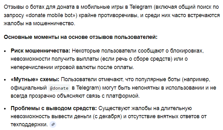 - пользователи о площадке «Донат Мобиле бот» оставляют негативные отзывы.