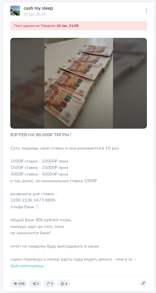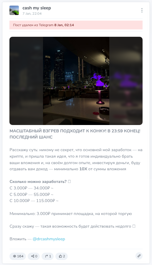 Cash My Sleep — канал в ТГ, автор которого позиционируется миллионером, разбогатевшим на крипте. Публикует много постов в стиле «красивая жизнь» с пачками денег и дорогими авто. Продвигает свои схемы по заработку на крипте с якобы быстрыми высокими доходами.