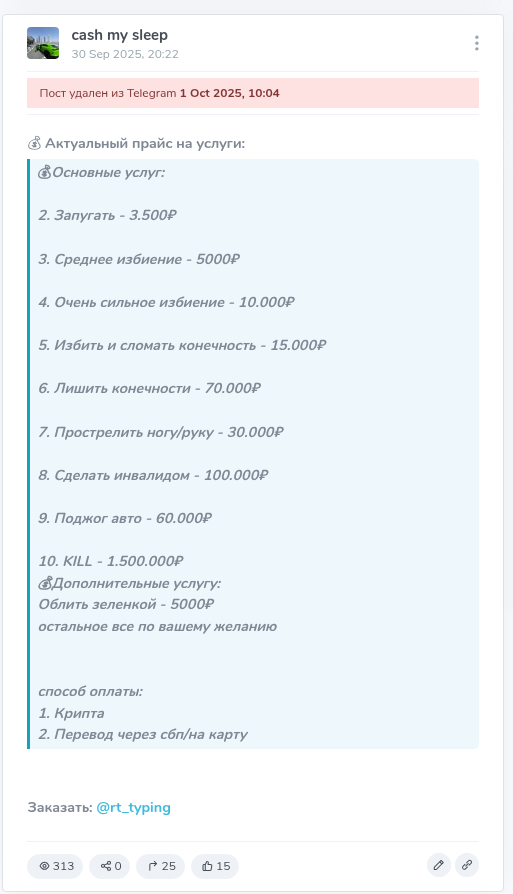 Второе, что больше всего пугает — услуги, которые канал предлагал ранее — от запугивания людей до их убийства. Скорее всего, админ не занимался подобным, он просто обманывал наивных людей за счет криминальных услуг.