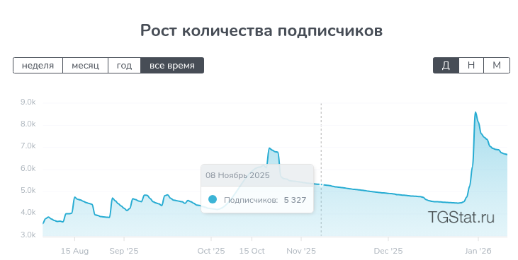 Создан канал в мае 2025 года. На январь 2026 года у него 6,6 тысячи подписчиков. Прирост аудитории за месяц составляет почти 23 тысячи человек. Отток — почти 700 людей за неделю.