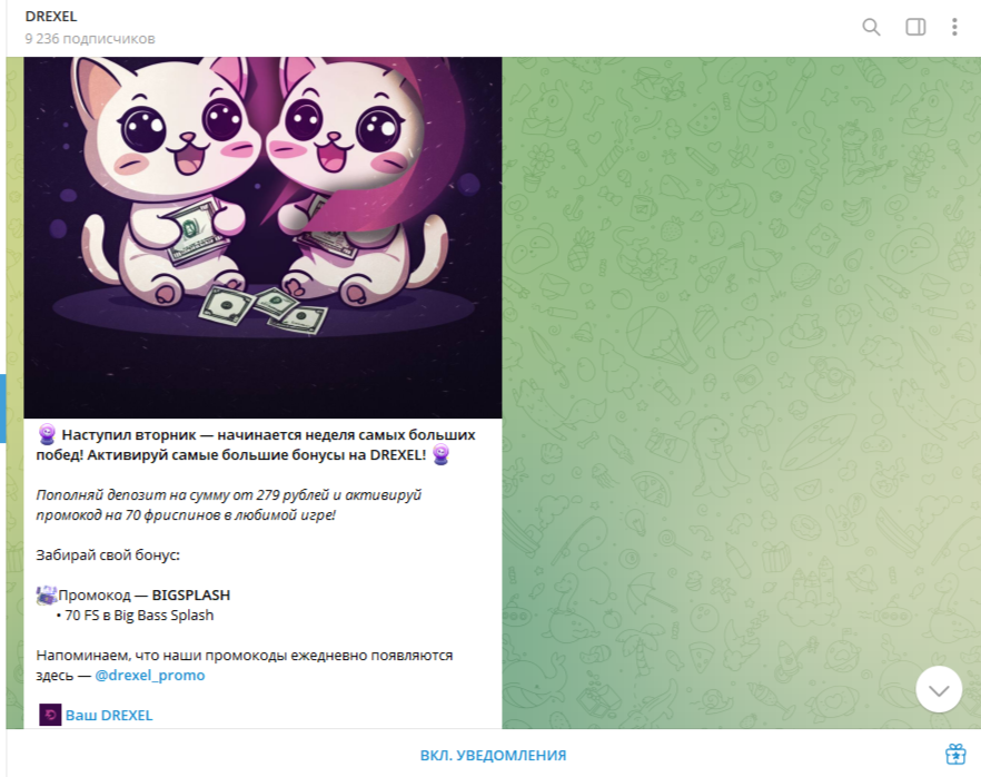 На телеграмм-канал @Draxel_games подписано 9 236 человек. Контент в сообществе посвящен в том числе и другим продуктам компании, которые являются казино-играми. Чаще всего авторы просто размещают промокоды.