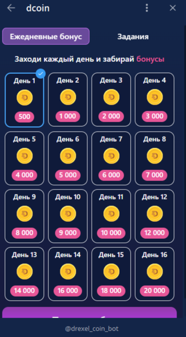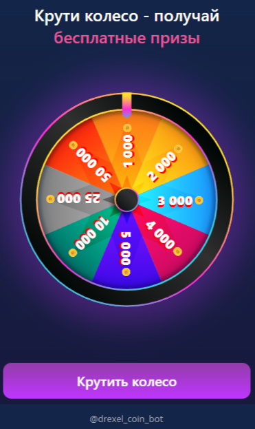 Геймплей очень прост: все, что нужно пользователю – кликать по большой монетке, и таким образом увеличивать количество токенов. В правом нижнем углу можно вращать барабан, где выпадает ежедневный бонус – сумма Drexel Coin от 1 000 до 50 000.