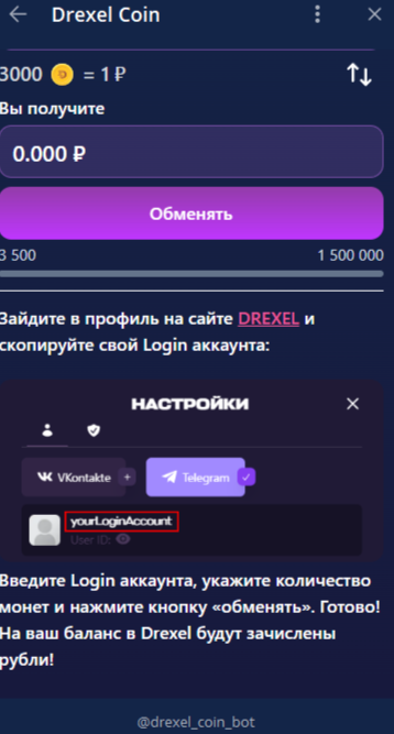 В боте команда проекта упоминает листинг и противопоставляет его популярной в 2024 году тапалке Hamster Kombat, однако «Дрексел» работает по принципу казино, его монеты не будут торговаться на бирже и не представляют собой токены, это лишь внутриигровая валюта. Маскировка под кликер – скорее рекламный инструмент.