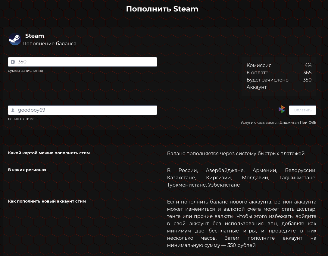 Клиенты дополнительно могут воспользоваться инструментом для пополнения аккаунта в стим с комиссией всего 4%: