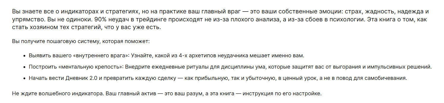 Книга не вводит новые торговые стратегии, а ориентирована на то, чтобы помочь читателю освоить уже имеющиеся у него подходы через контроль над собственным мышлением. Для этого предлагается пошаговая система, которая включает выявление личного внутреннего врага в форме одного из четырех архетипов неудачника. Завершает систему ведение Дневника 2.0, где каждая сделка анализируется как урок для роста.
