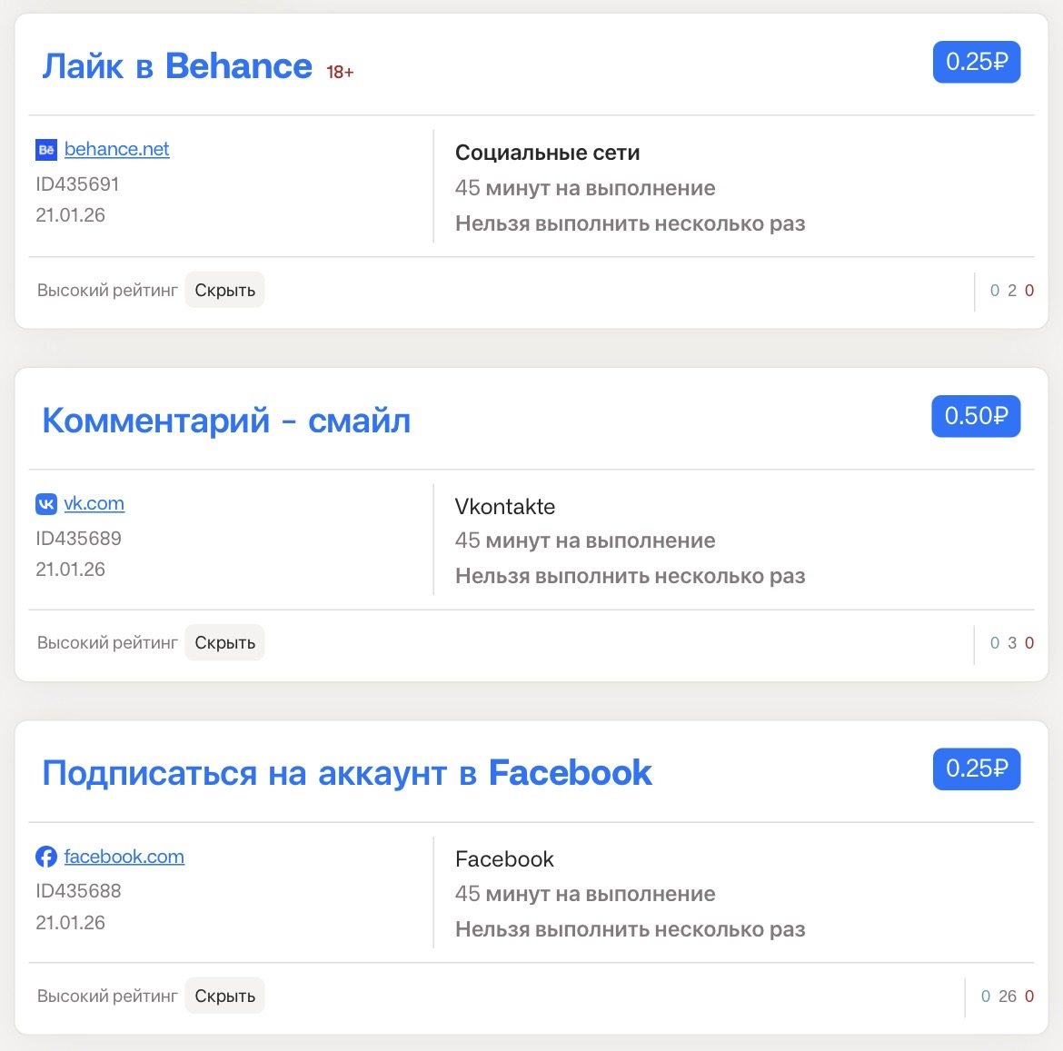 Многие задания связаны с переходом на сторонние ресурсы, которые могут содержать вредоносное ПО или формы для кражи паролей. Платформа не несет ответственности за контент, который размещают заказчики.