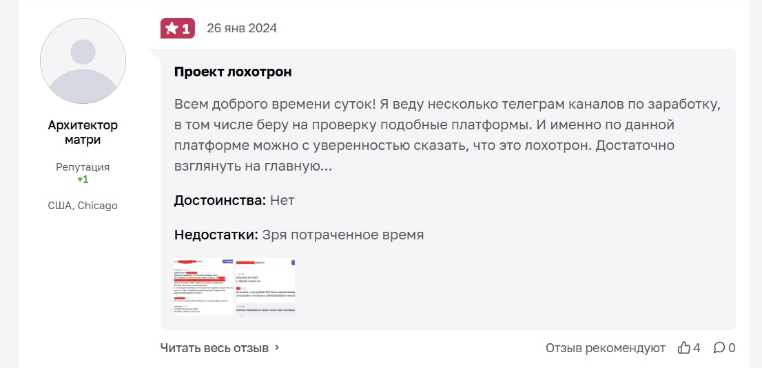 Этот проект — чистый развод. Обещают золотые горы за простые задания, а в итоге требуют вложений и ничего не выплачивают. Не ведитесь на этот лохотрон.