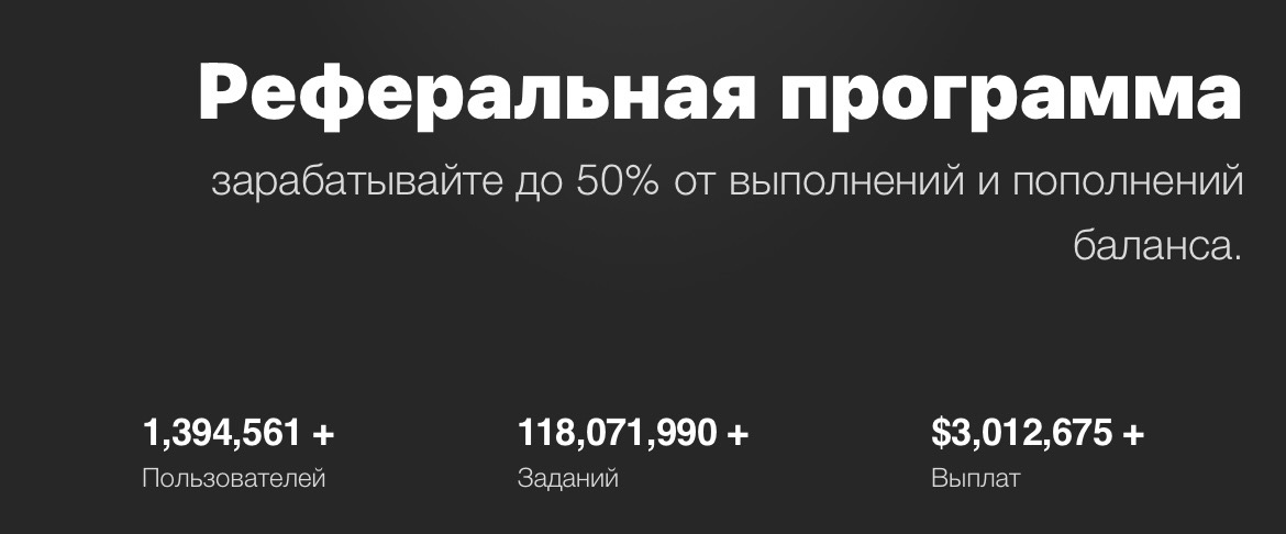 У компании также есть реферальная программа, которая создана как способ для пассивного заработка для тех, кто готов привлекать новых пользователей на площадку. Система обещает вознаграждение до 50% от доходов привлеченных рефералов или трат заказчиков.