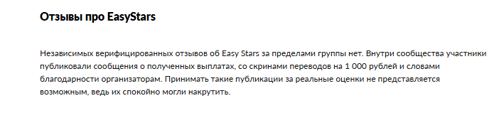 Отзывов о платформе Easy Stars крайне мало. Вся коммуникация велась внутри закрытой группы ВКонтакте. Администраторы контролировали публикации, а после закрытия проекта следы быстро исчезли.