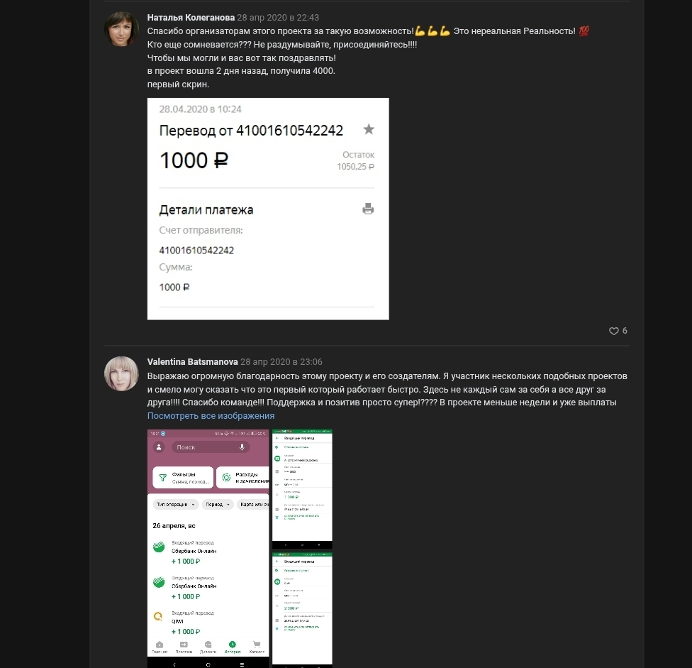 Организаторы давали рекомендации по оформлению платежей через Сбербанк онлайн и по распространению информации о проекте среди знакомых. Клиентам предлагалась поддержка в закрытой группе ВКонтакте. Там публиковались примеры успешных выплат и обсуждались текущие этапы движения в таблице.