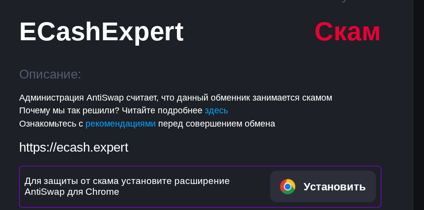 Репутация у платформы явно неоднозначная. На BestChange есть только положительные фидбеки. Однако учитывая большую вероятность покупки, мы не исключаем, что они фейк. На Antiswap ситуация иная — есть только негативные отзывы о Ecash Expert, где пользователи жалуются на развод. Ниже пример обратной связи.