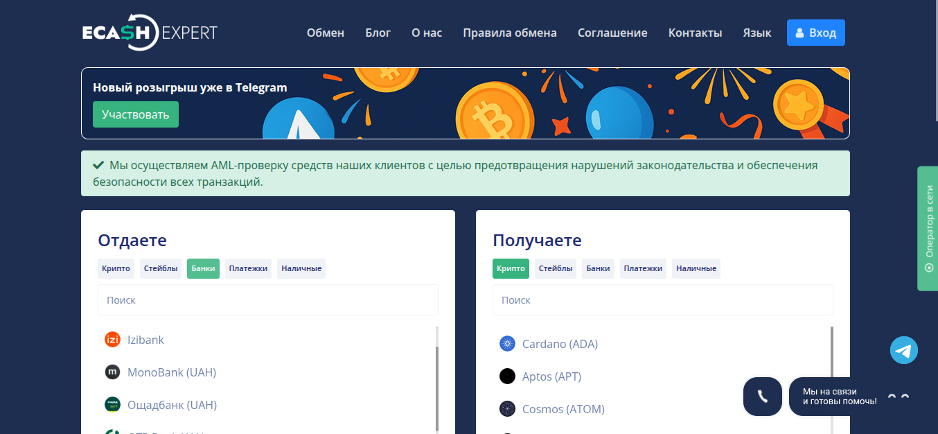 Ecash Expert — финансовый проект, который активно использует давно известную концепцию посредничества при конвертации активов. Обменник позволяет в режиме реального времени поменять криптовалюты на фиатные средства. Помимо этого, проект предлагает инструментарий, чтобы за наличные деньги купить токены.