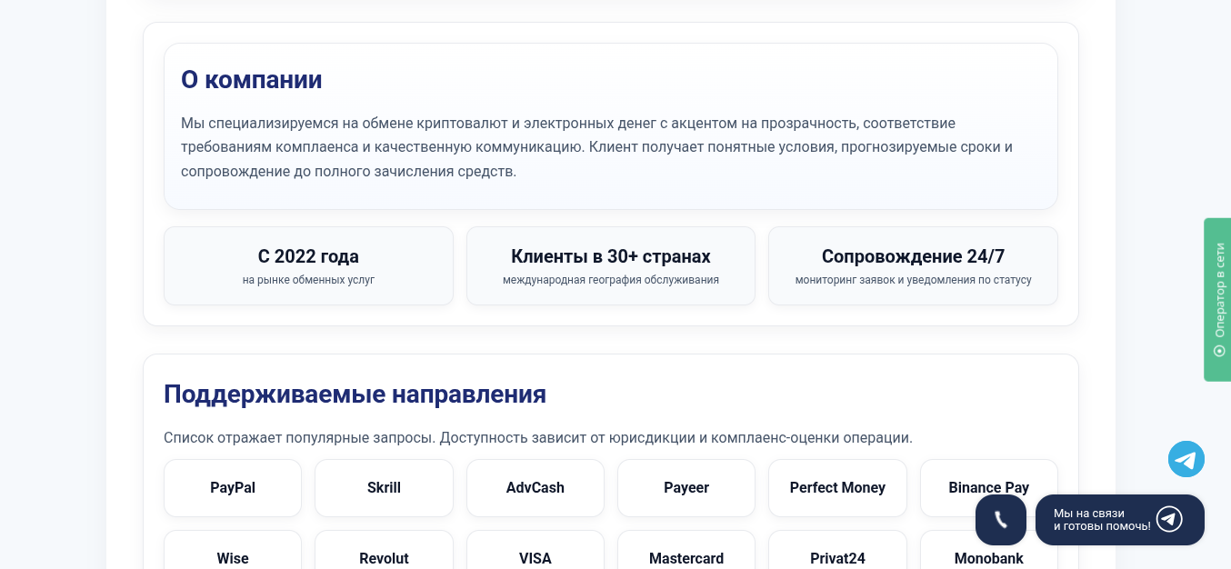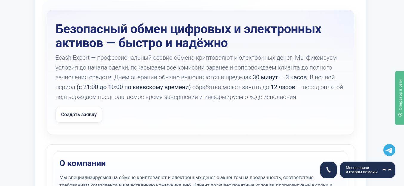 Судя по информации с сайта, стартовал проект в 2022 году. За это время обменник получил клиентскую базу в более 30 странах. Вдобавок к этому, создатели обменника EcashExpert отметили круглосуточную поддержку пользователей.