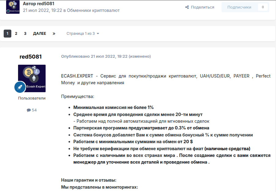 Контакт с целевой аудиторией на тематической площадке стартовал 21 июля 2022 года. Последний визит был 23 июня 2025. В треде на форуме по криптовалютам менеджеры рассказали, что верификации при обмене криптовалют на фиат нет, а также конвертации по всем странам мира.
