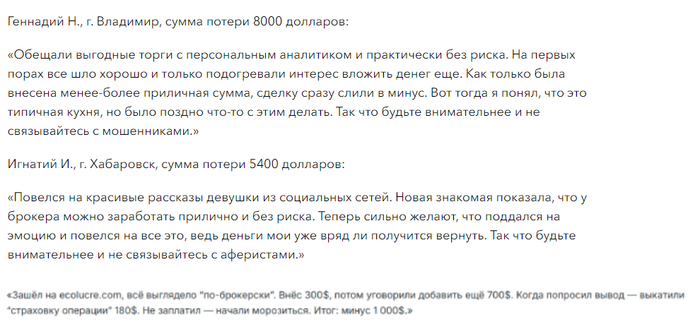 В реальности платформа брокера представляет собой лохотрон, заработать на котором могут только его разработчики. Обман аудитории производится с помощью фейковых сведений, размещенных на сайте. Например, электронный адрес техподдержки аферисты из «Эколукре Ком» опубликовали фальшивый.